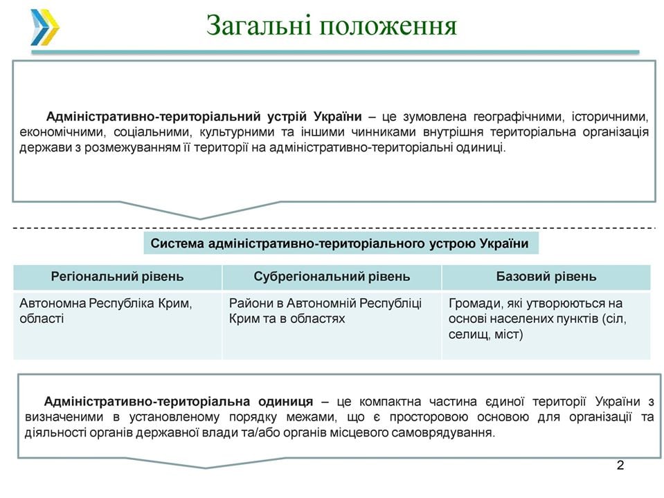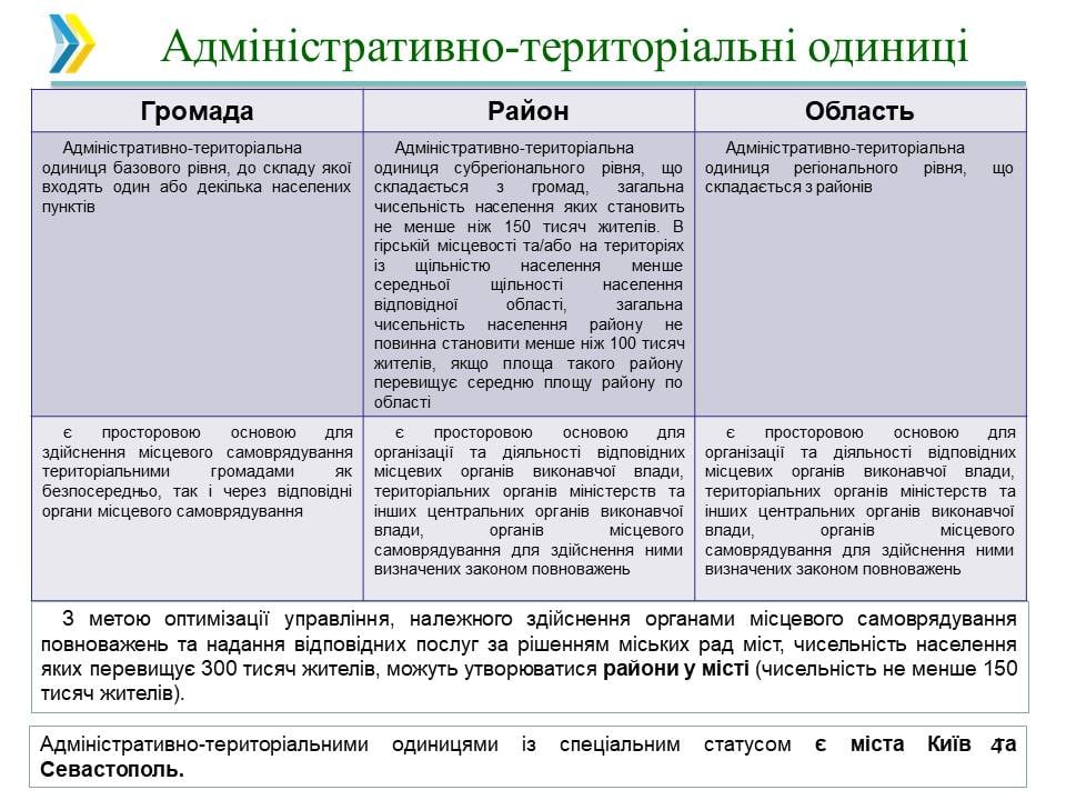 ✅ вводяться поняття: адміністративно-територіального устрою України, адміністративно-територіальної одиниці, населеного пункту та інші;