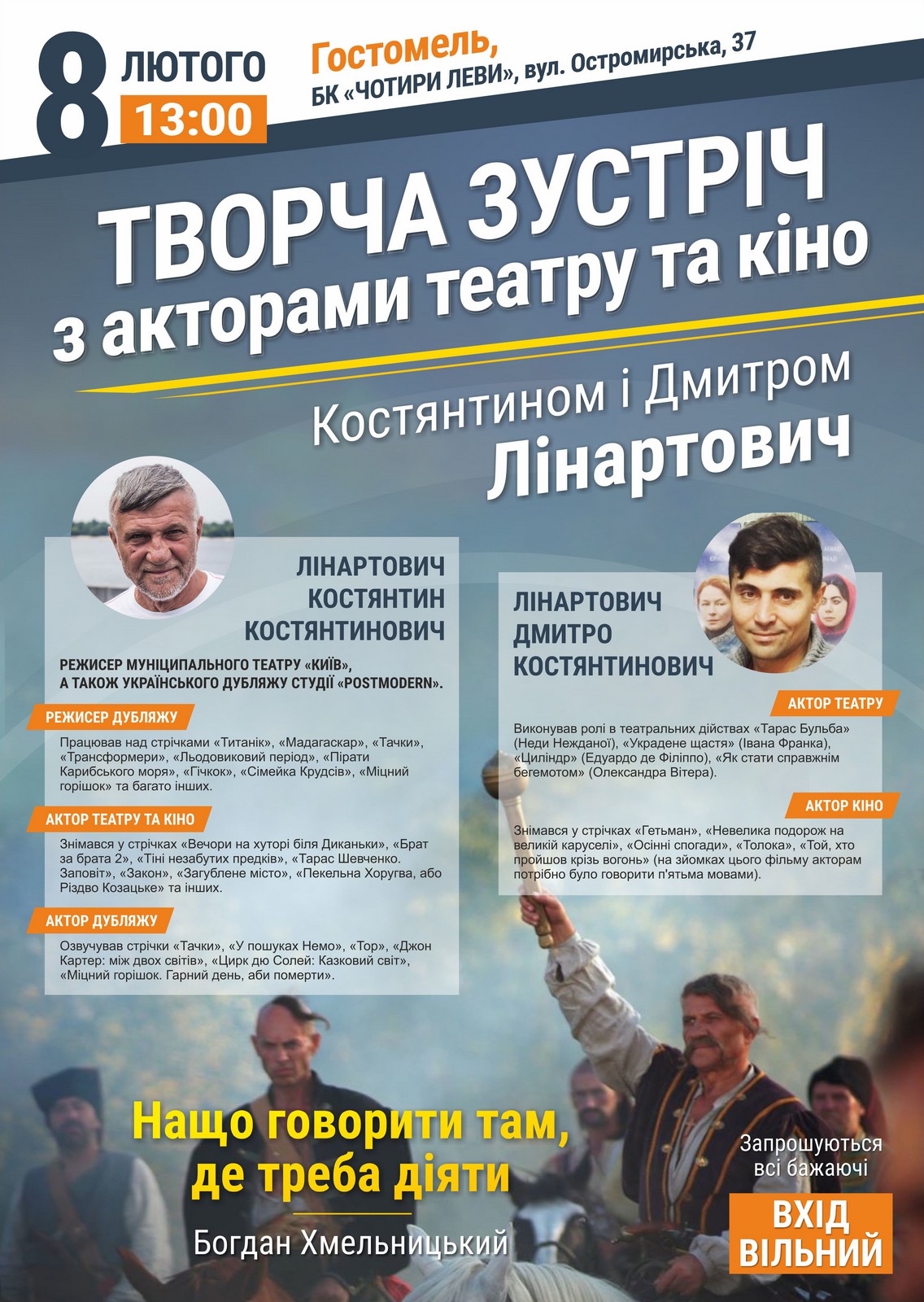 Субота, 8 лютого до Будинку культури «Чотири леви» завітають відомі сучасні актори, виконавці ролей у серіалі «Гетьман» Костянтин та Дмитро Лінартовичи.