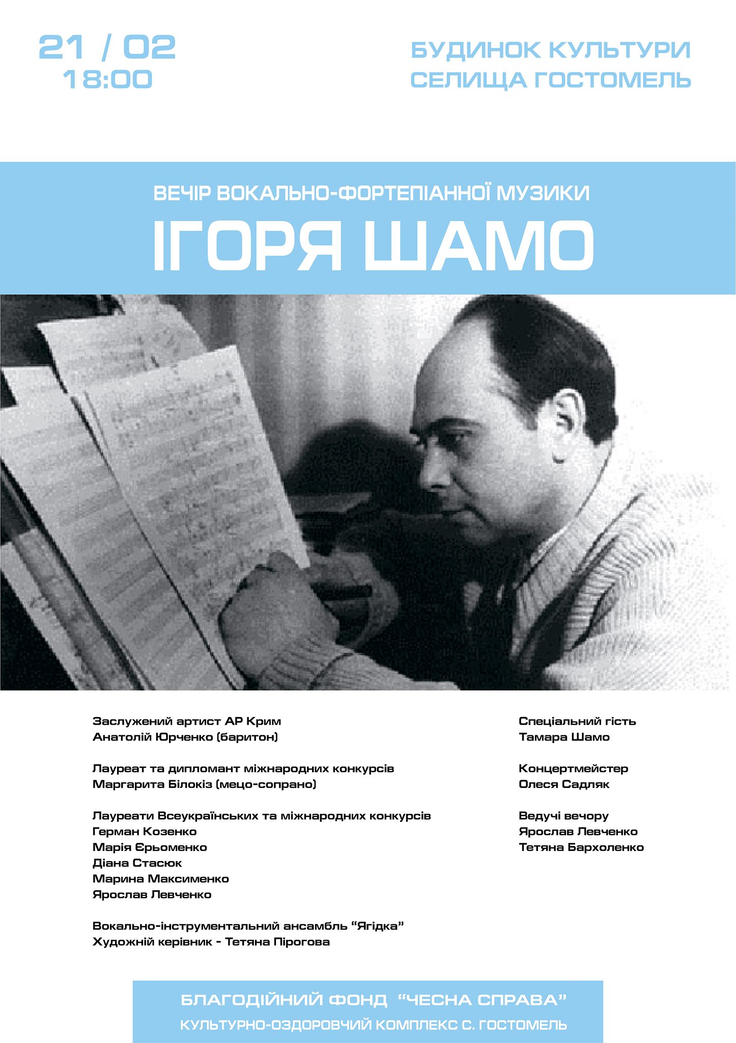 У п’ятницю, 21 лютого в культурно-оздоровчому комплексі селищі відбудеться вечір вокально-фортепіанної музики композитора Ігоря Шамо. Початок о 18:00.