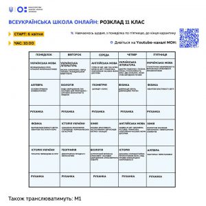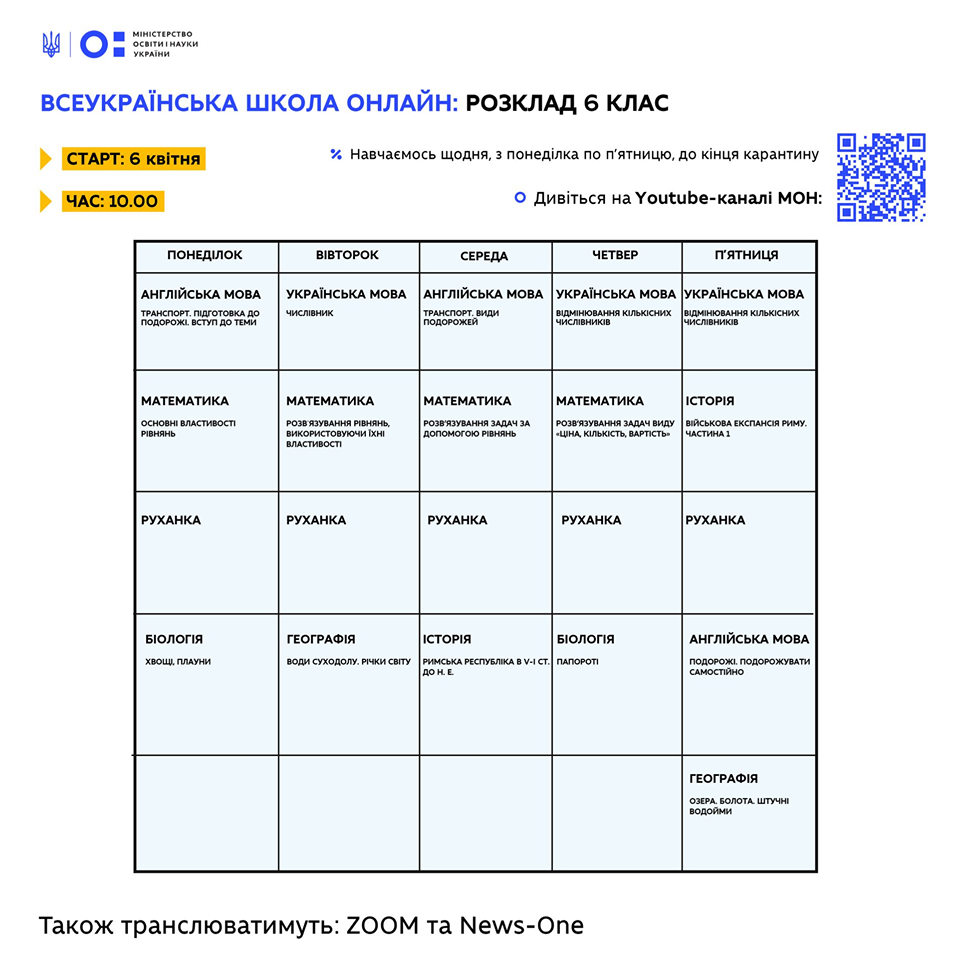 Щоранку, о 10:00, з понеділка до п’ятниці уроки транслюватимуть такі телеканали: